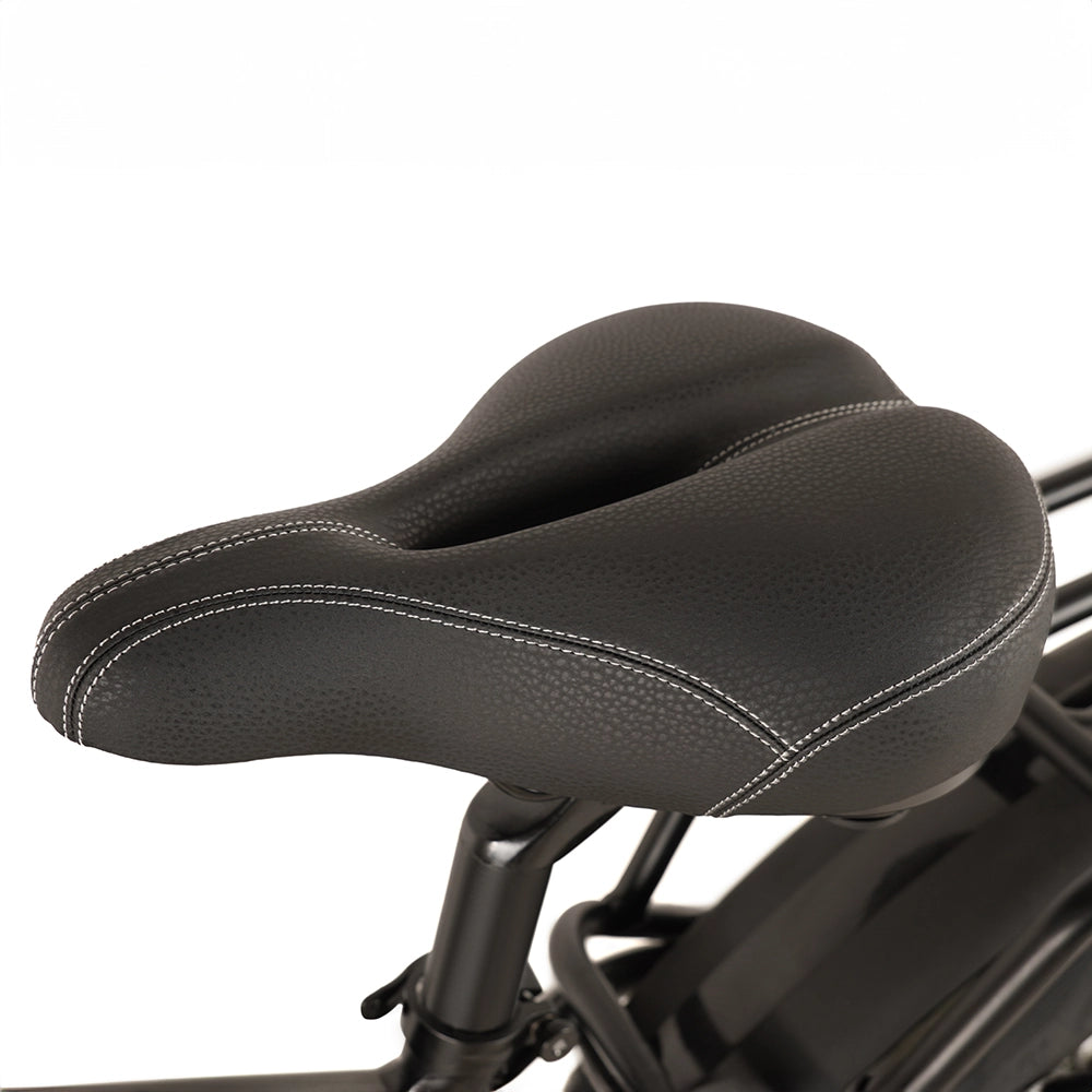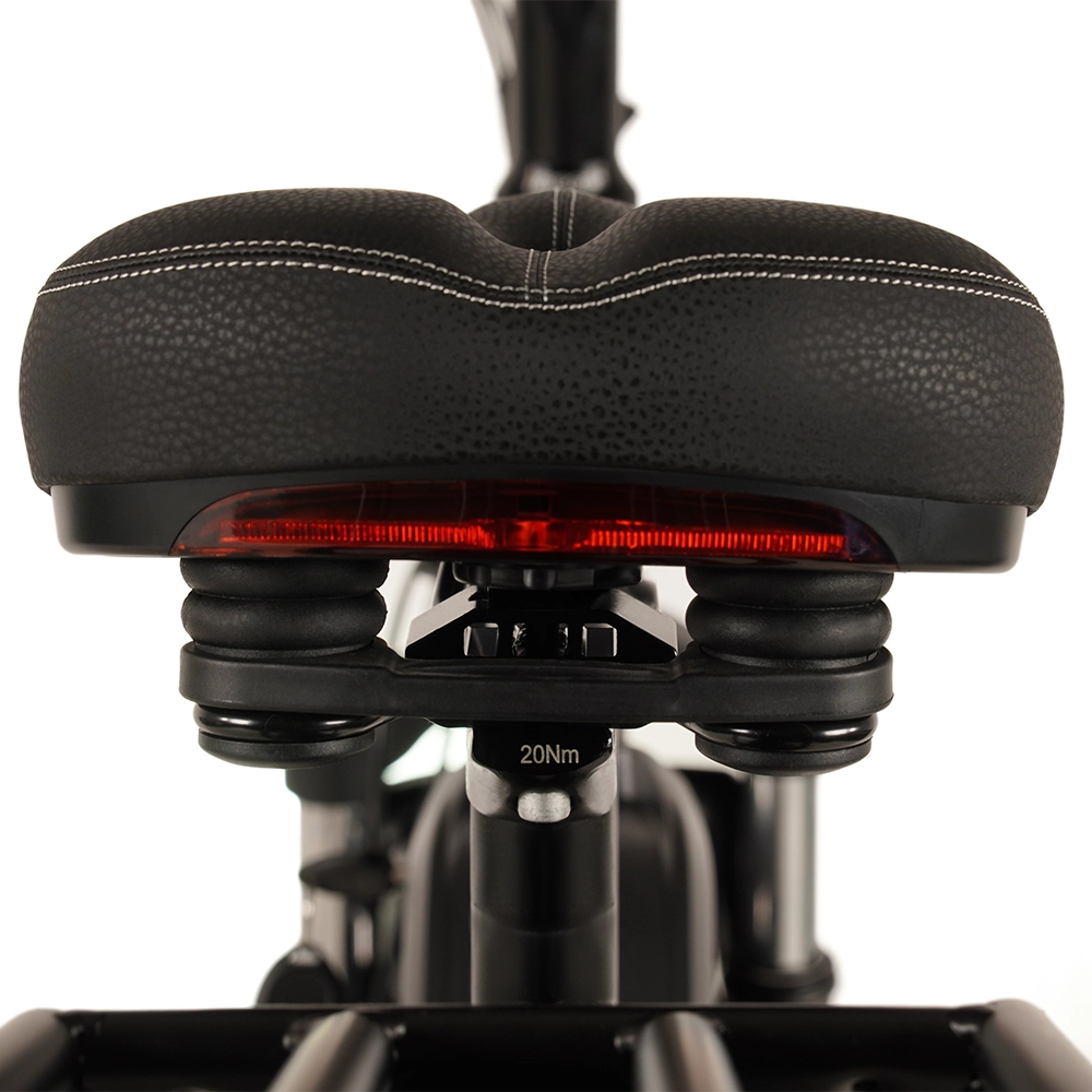 Ride in comfort with the ultra-comfort, adjustable spring-loaded saddle and ergonomic rubber grips that reduce fatigue on longer rides. The integrated LED front light and rear taillight with brake signals enhance visibility and safety during low-light conditions. The rear rack supports up to 30kg, perfect for carrying gear on your off-road adventures.