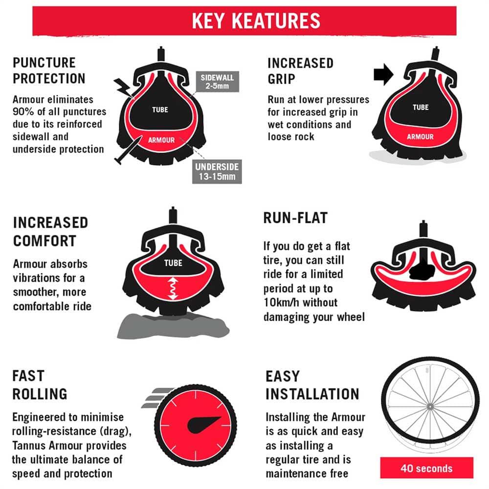 Tannus Armour reduces punctures by up to 90%, but cannot eliminate all punctures. The 15mm protective layer blocks most sharp objects, but very large penetrations may still occur. If a puncture happens, the run-flat capability (excluding fat tyres) allows short-distance riding to reach a repair location.